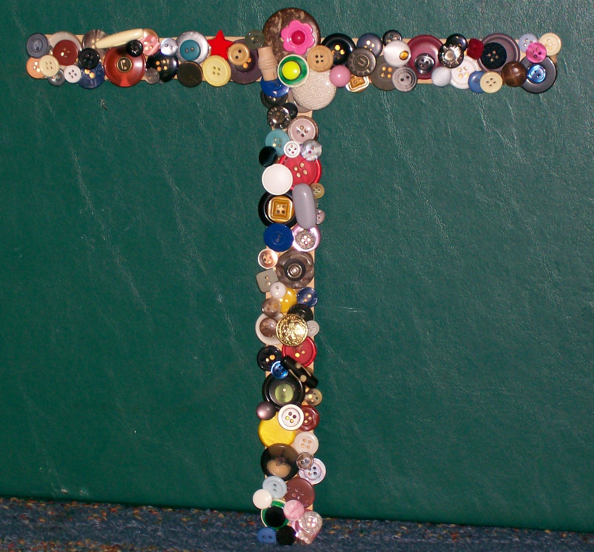 I was assigned the letter T. So I sat down at the card table with two paint sticks, a little craft wire, my stash of buttons, and a glue gun. Turned on the latest Masterpiece Theater movie that I had recorded with my DVR, and spent an hour and a half being creative. What fun!
