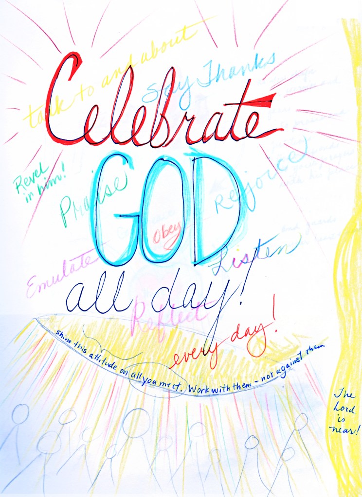 Celebrate God all day, every day. I mean, revel in him! Make it as clear as you can to all you meet that you’re on their side, working with them and not against them. Help them see that the Master is about to arrive. He could show up any minute!