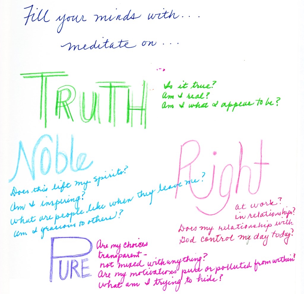 “How can I control what thoughts fill my mind? I can’t spend my whole day meditating, and other thoughts creep in.” Of course, they do, but how much space and importance do we give them? At the end of the day do I list all the things that went wrong? Are my prayers a listing of everything bad and a scream to have them fixed? (sometimes!) What if I filled my mind with thoughts and questions about what was true, noble, right, and pure during my day. It’s not just an index of hurts, but a search for God’s hand on me during the day. After these kinds of questions, I can ask God to take the residue of angst and pain and replace it with his peace. He will.