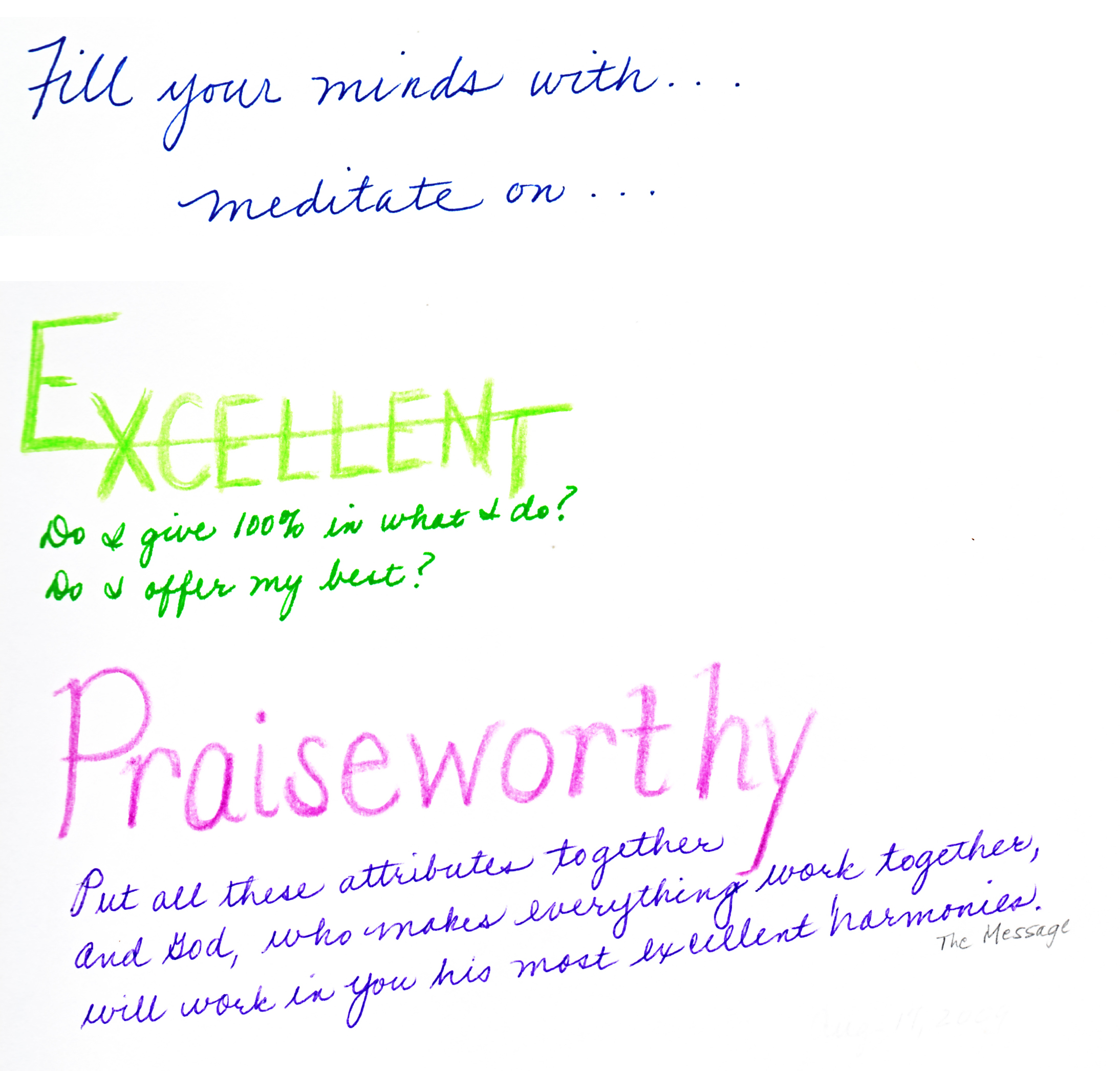 If my mind is full of these Godly thoughts–true, honorable, right, pure, lovely and admirable thoughts–will my life reflect them? As I heard from Marty Schmidt Sunday morning, it was Paul (also an imperfect human) who said, “Keep putting into practice all you learned and received from me—everything you heard from me and saw me doing. Then the God of peace will be with you.” Isn’t that a little audacious? If Jesus said these words, we would all agree and try to live that way. Paul isn’t perfect, so why should we try to live like he does? If I fill my mind with God, fill my soul with God, what will overflow and splash on those around me? And will I feel anxiety/anger/spite or God’s peace? Will those around me be able to tell the difference in me?