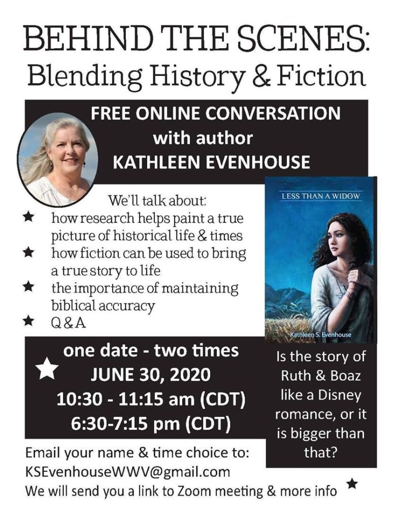 Readers, writer, and curious minds, local author Kathleen Evenhouse would like to take you “behind the scenes” in the re-writing of Biblical stories as historical fiction. You don’t need to dress up or leave home for this FREE 45-minute Zoom meeting on June 30. Your choice of times: 10:30 am or 6:30 pm. Only 10 participants per session will allow great opportunity for Q&A plus conversation.