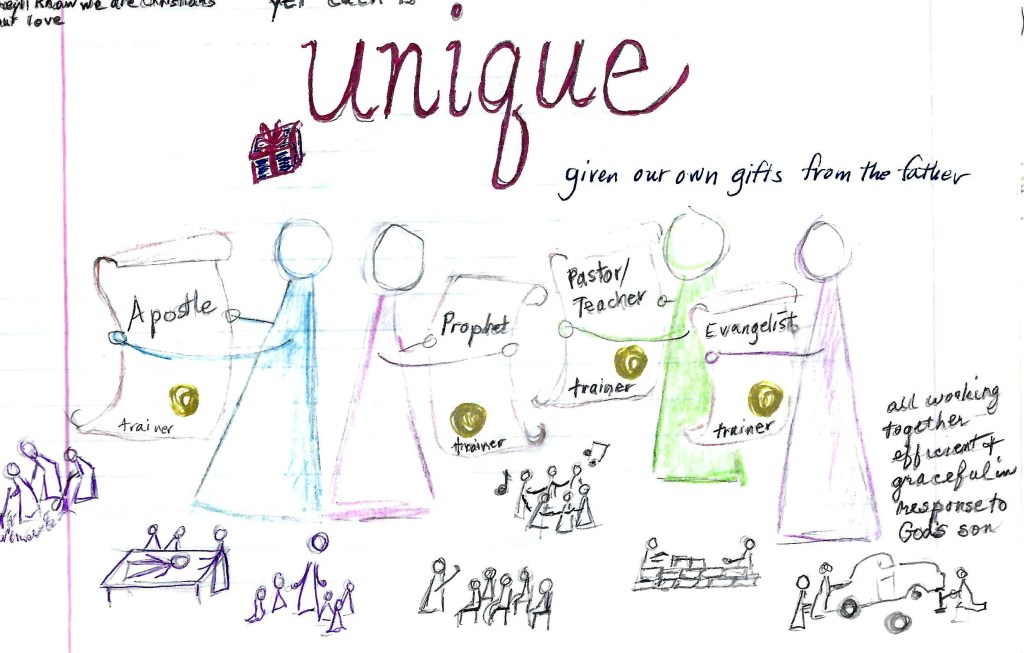 | Jesus’ gifts are: apostles, prophets, evangelists, pastors, and teachers (11) | These gifts are given to us by God; they are a Divine appointment, not a human invention (11). |