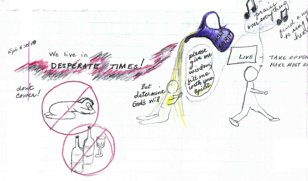 | Fools act thoughtlessly, get inebriated or high, and search for opportunities to engage in worldly pleasures (5:15-20). | Look for opportunities to live by the Spirit’s power with careful wisdom, so that God’s light shines through you. The Holy Spirit’s filling will show up in a musical life of praise and thanks (5:15-20). |