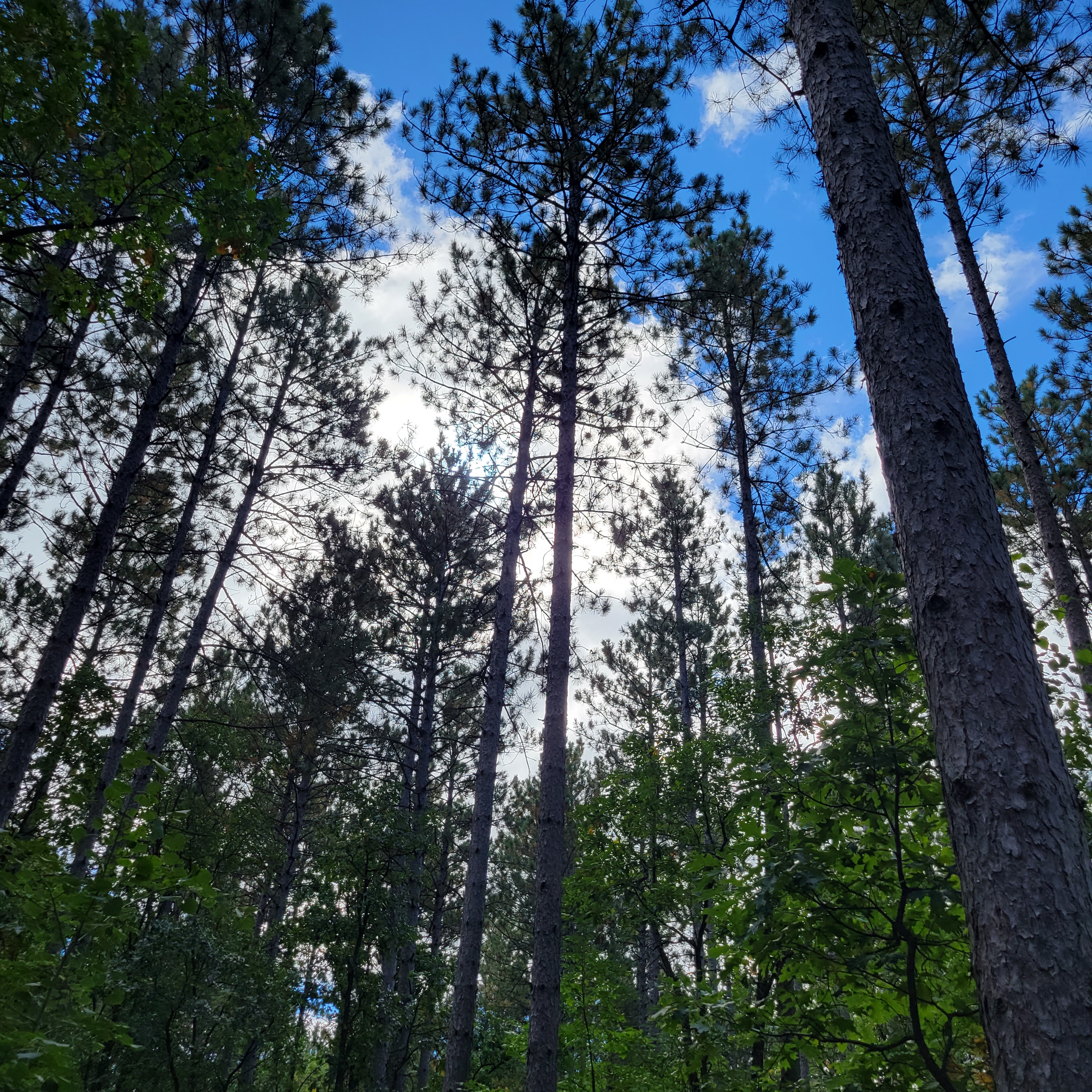 Between straight tall pines and white birch trunks.