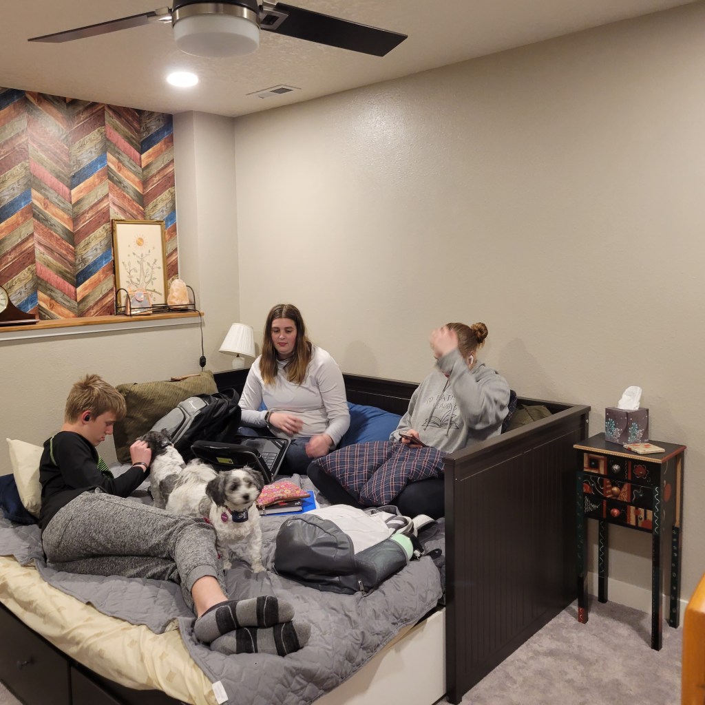Togetherness in the guest room bedroom, grandkids, and doggos joining me downstairs in our apartment. The warning siren is sounding over and over as funnel clouds and tornados are spotted and heading toward us. Grandpa and dad are in our living room of our basement apartment, a room with two windows. But they are men. At least they are not standing outside on the driveway trying to see it coming.