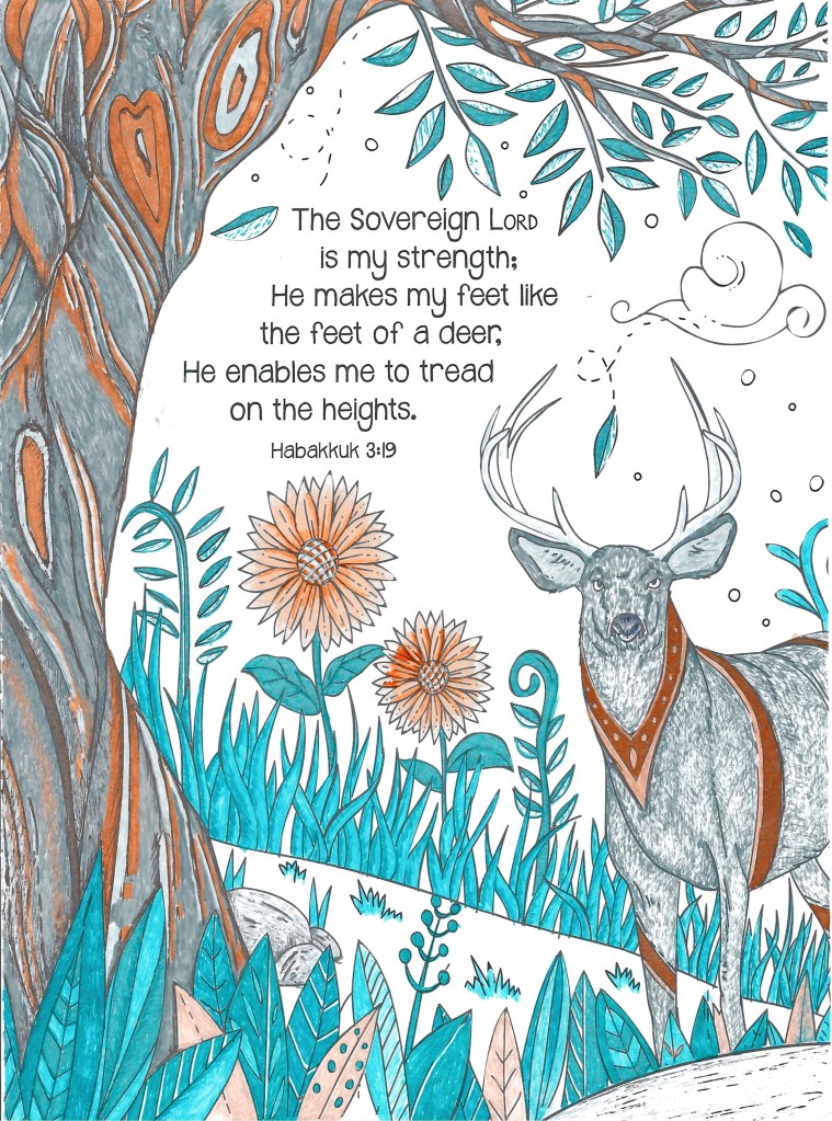 August 16, 2023July 25, 2023 by Kathleen S. Evenhouse Bookmark Bible Doodle: Habakuk 3:19 I’m singing joyful praise to God. I’m turning cartwheels of joy to my Savior God.Counting on God’s Rule to prevail, I take heart and gain strength.I run like a deer. I feel like I’m king of the mountain! Habakuk 3:19, The Message Share this: Click to share on Pinterest (Opens in new window) Pinterest Click to share on LinkedIn (Opens in new window) LinkedIn Click to share on X (Opens in new window) X Click to share on Facebook (Opens in new window) Facebook Click to email a link to a friend (Opens in new window) Email Click to print (Opens in new window) Print Like Loading... Related