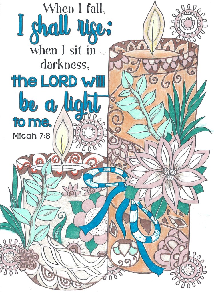 September 6, 2024July 30, 2024 by Kathleen S. Evenhouse Bookmark Bible Doodle: Micah 7:8 I don’t have to get up on my own strength–the Lord gives me a handAnd the light, His light shines out from within me. Share this: Click to share on Pinterest (Opens in new window) Pinterest Click to share on LinkedIn (Opens in new window) LinkedIn Click to share on X (Opens in new window) X Click to share on Facebook (Opens in new window) Facebook Click to email a link to a friend (Opens in new window) Email Click to print (Opens in new window) Print Like Loading... Related