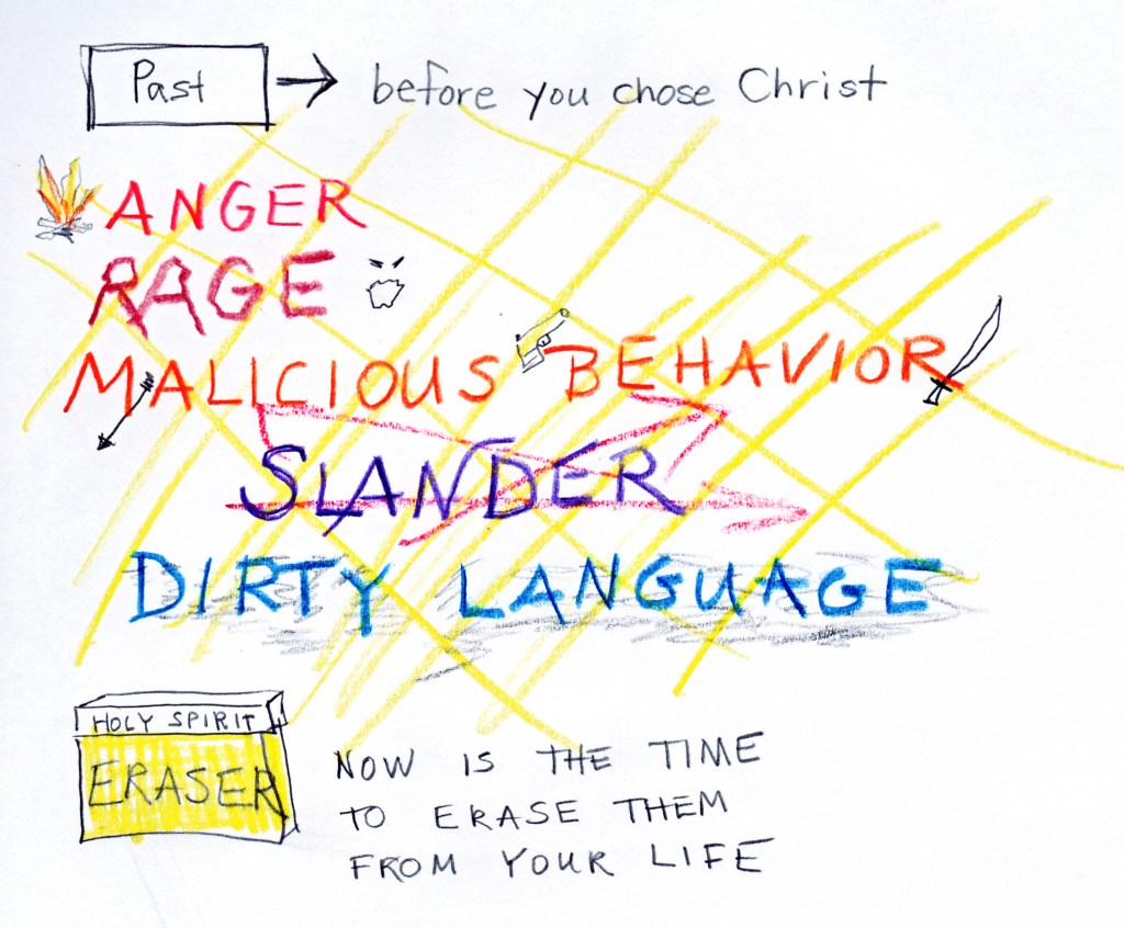 5-8 And that means killing off everything connected with that way of death: sexual promiscuity, impurity, lust, doing whatever you feel like whenever you feel like it, and grabbing whatever attracts your fancy. That’s a life shaped by things and feelings instead of by God. It’s because of this kind of thing that God is about to explode in anger. It wasn’t long ago that you were doing all that stuff and not knowing any better. But you know better now, so make sure it’s all gone for good: bad temper, irritability, meanness, profanity, dirty talk. (Colossians 3:3-8, The Message)