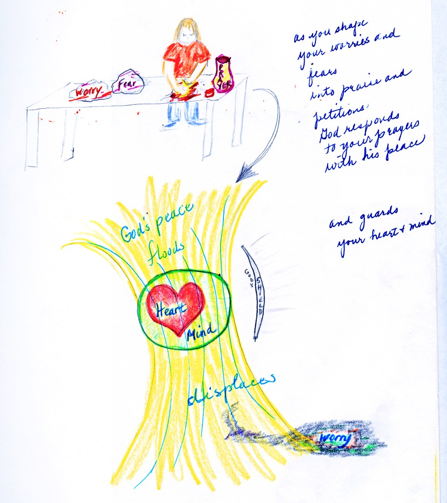 Because I am a visual learner, I have gone through books of the Bible and drawn what the words mean to me. This makes me take them inside myself, figure out what God is saying personally to me today, and drawing it so that I can repeat his words accurately. The pictures (from Phillipians 4:6) help me remember and make it able for me tohold these words in my heart.